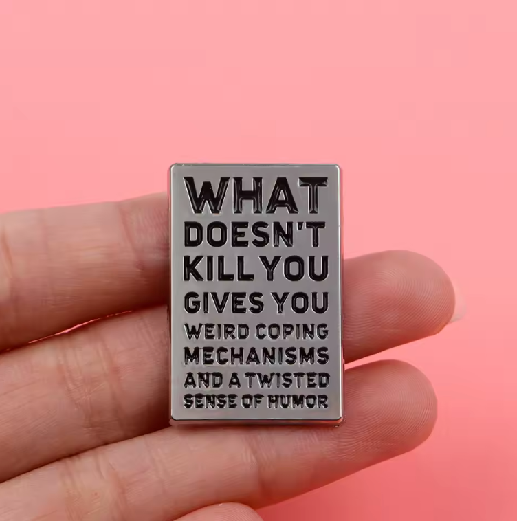 WHAT DOESN'T KILL YOU GIVES YOU AN UNHEALTHY SET OF COPING MECHANISMS AND A DARK SENSE OF HUMOR ENAMEL PIN